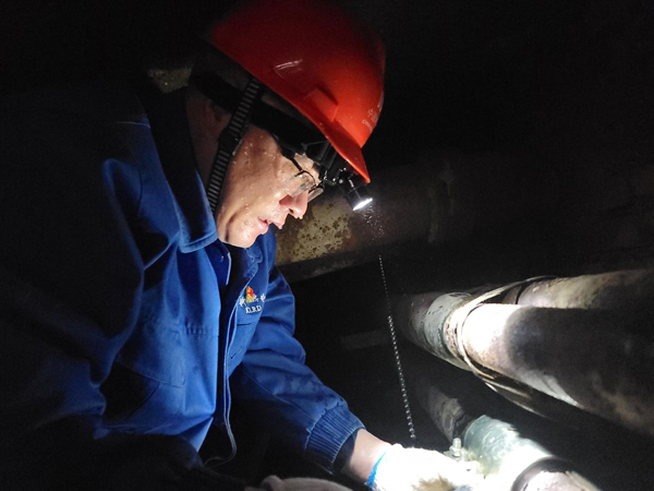 狭窄的通道内,张军半躬着身体曲腿前行,一边听着呲水声一边摸索着前进,在离井口5米处找到了正在不断呲水的漏点。他蹲在漏点旁,嘴中含着手电筒,将管卡覆盖漏点,顾不得强烈的水流顺着管卡喷溅到身上。由于八道螺丝需要均匀受力反复紧扣,在不足半米的空间内,他使出浑身力气拧着螺丝。当泄漏封堵完成,张军从井里爬出来时,浑身都已被水呲透。