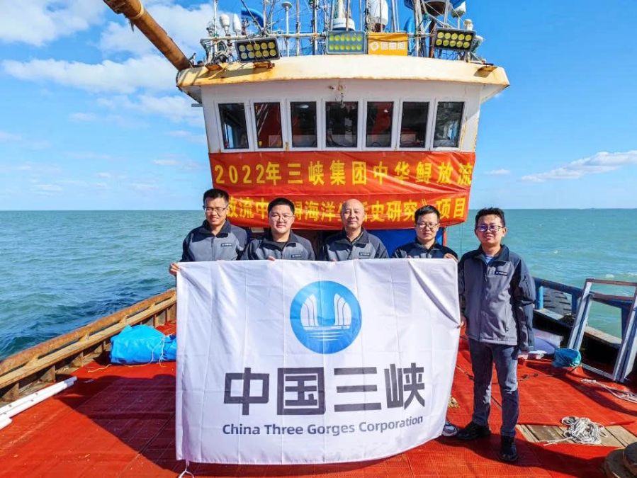 ▲2022年10月20日,在上海长江口水域放流中华鲟。(左二为朱佳志)摄影:陈臣